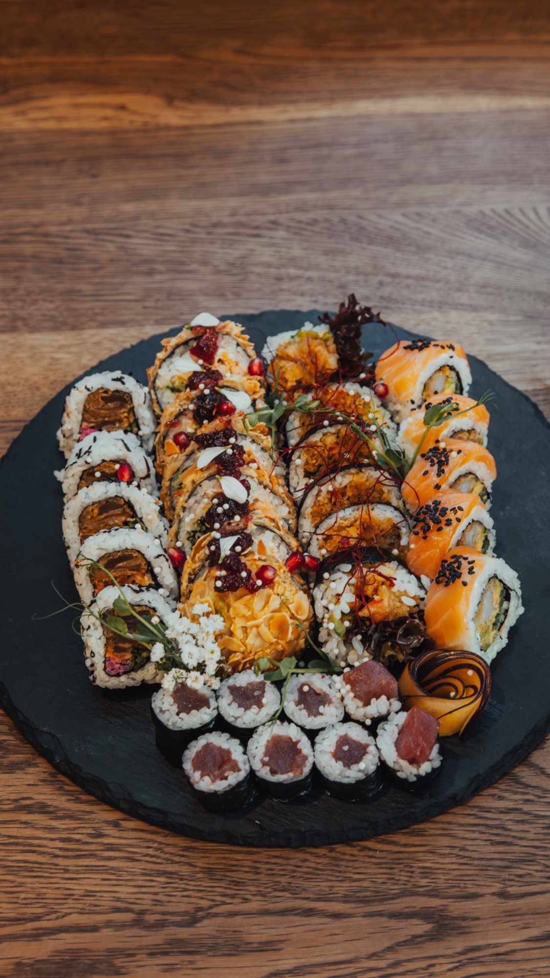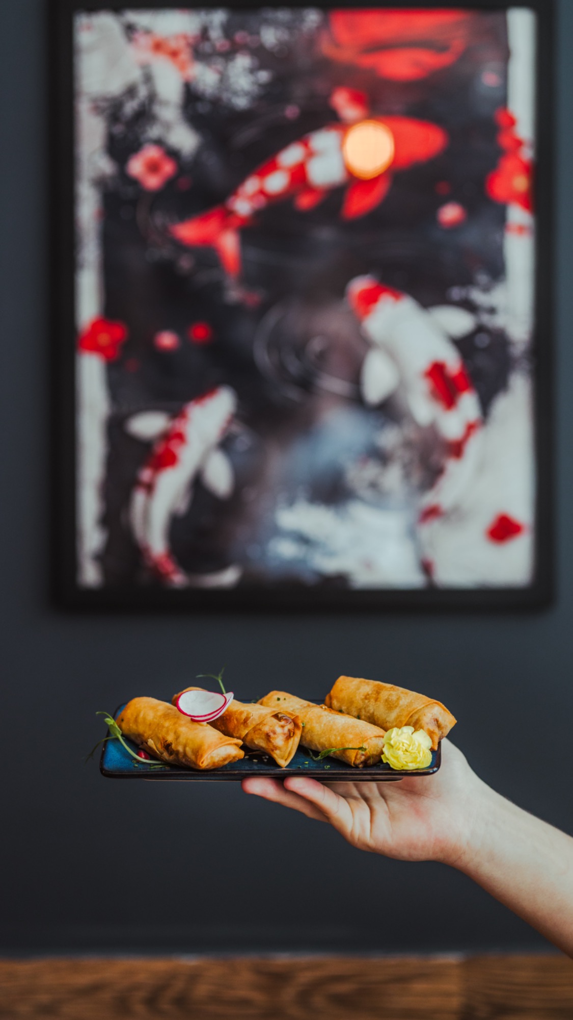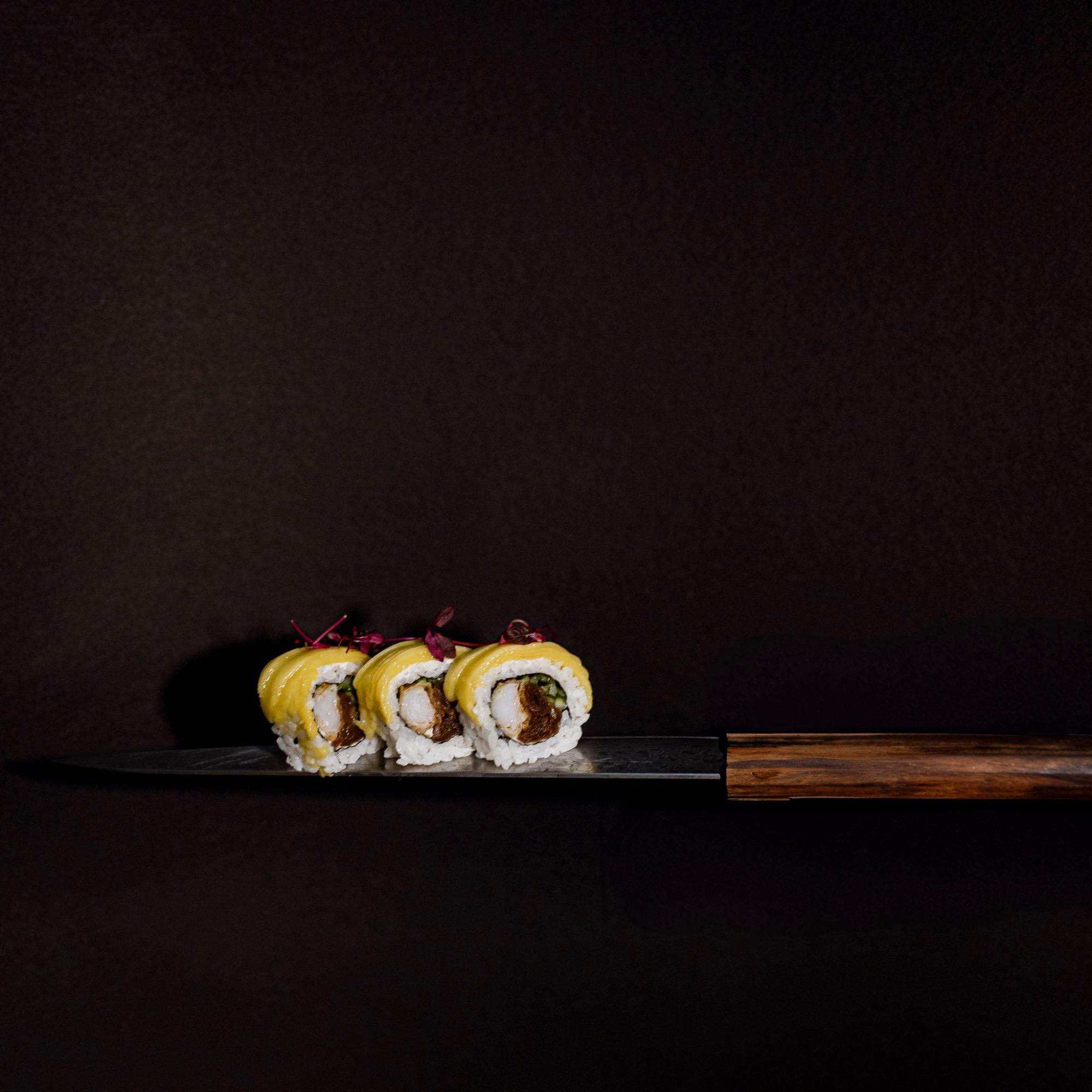 krab w panko, sos spicy mayo, szparag, mango, oshinko, sałata, wasabi, sos chili mango -