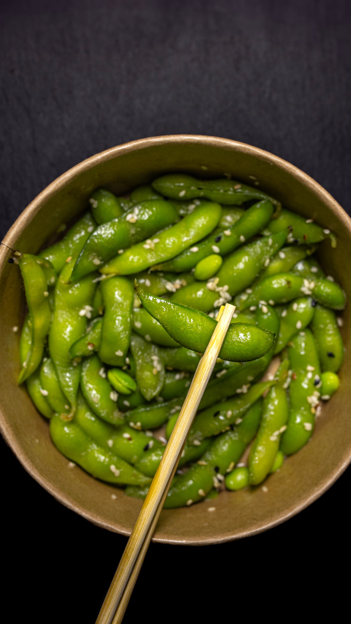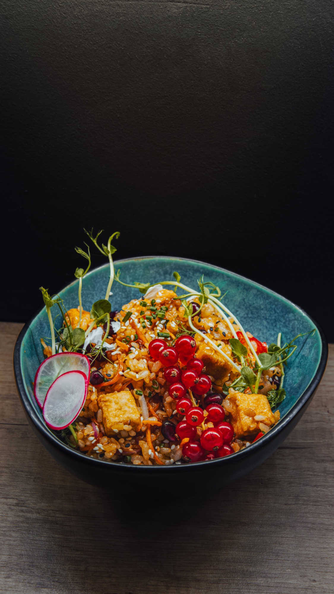 makaron udon z sosem, tofu, chrupiące warzywa, kiełki fasoli mung, fasolka szparagowa, orzechy ziemne, sezam, szczypiorek -