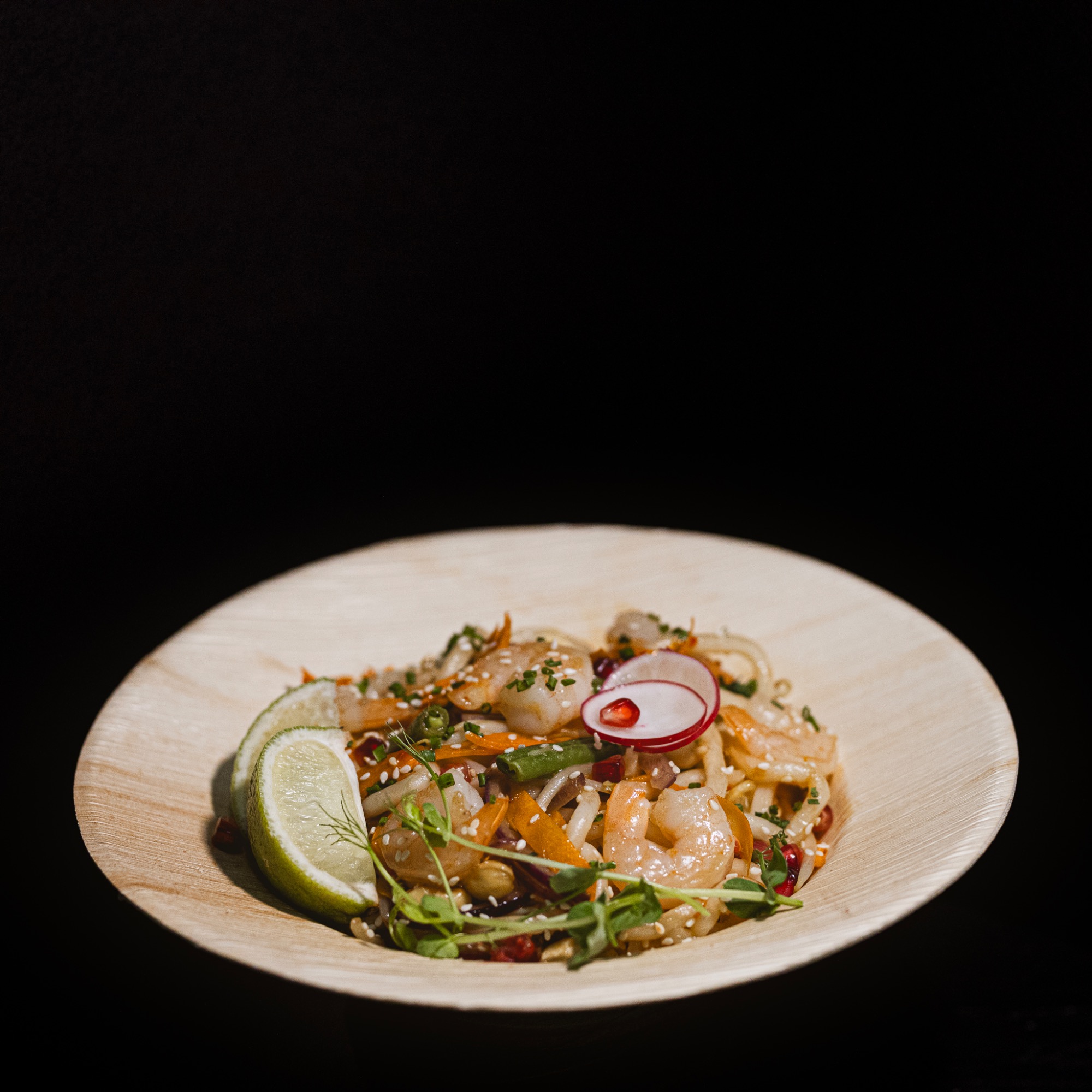 makaron ryżowy z sosem, krewetki podsmażane na maśle czosnkowym, marchew, cebula, kiełki fasoli mung, orzechy nerkowca, omlet tamago, sezam, szczypior, limonka