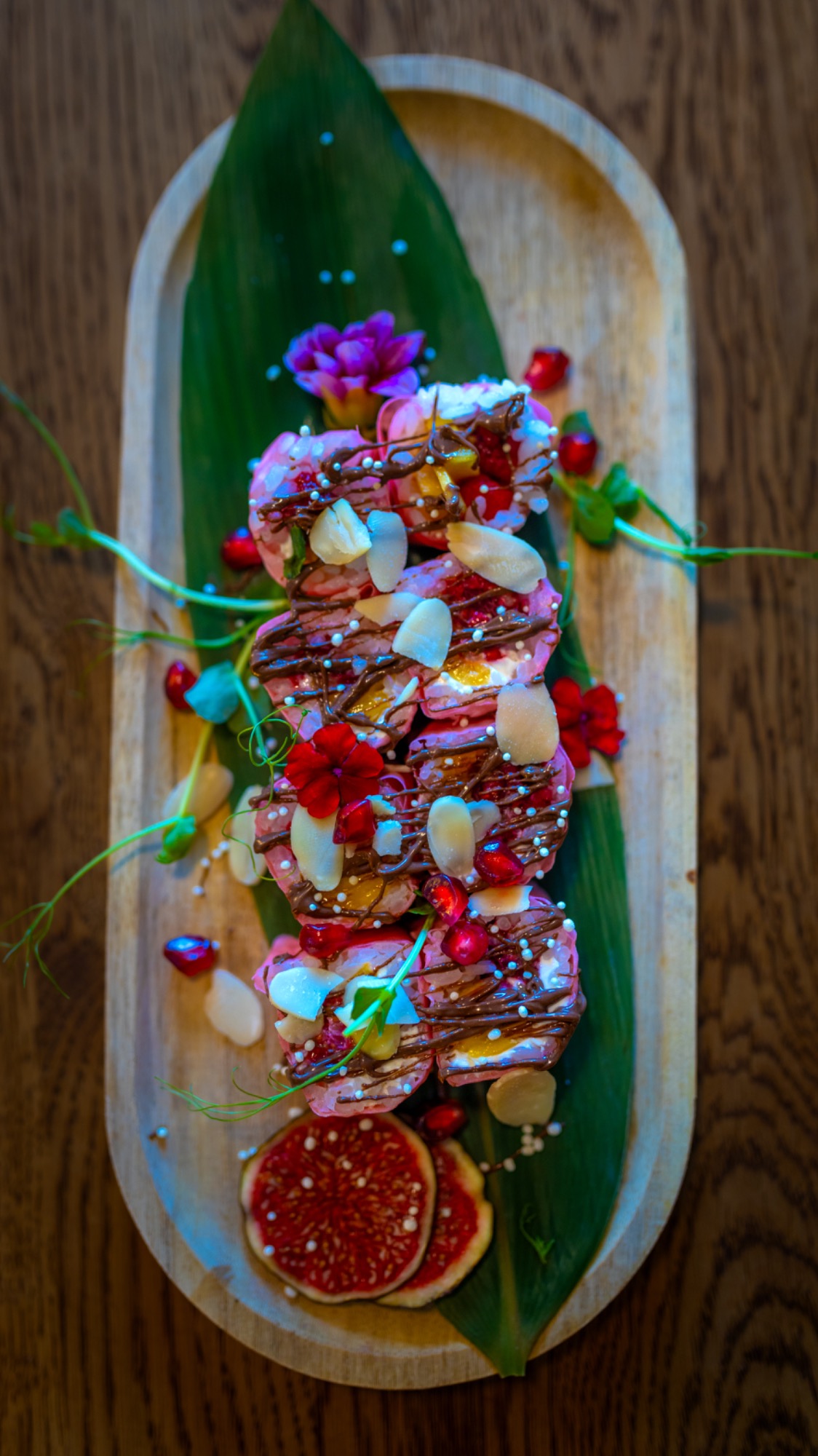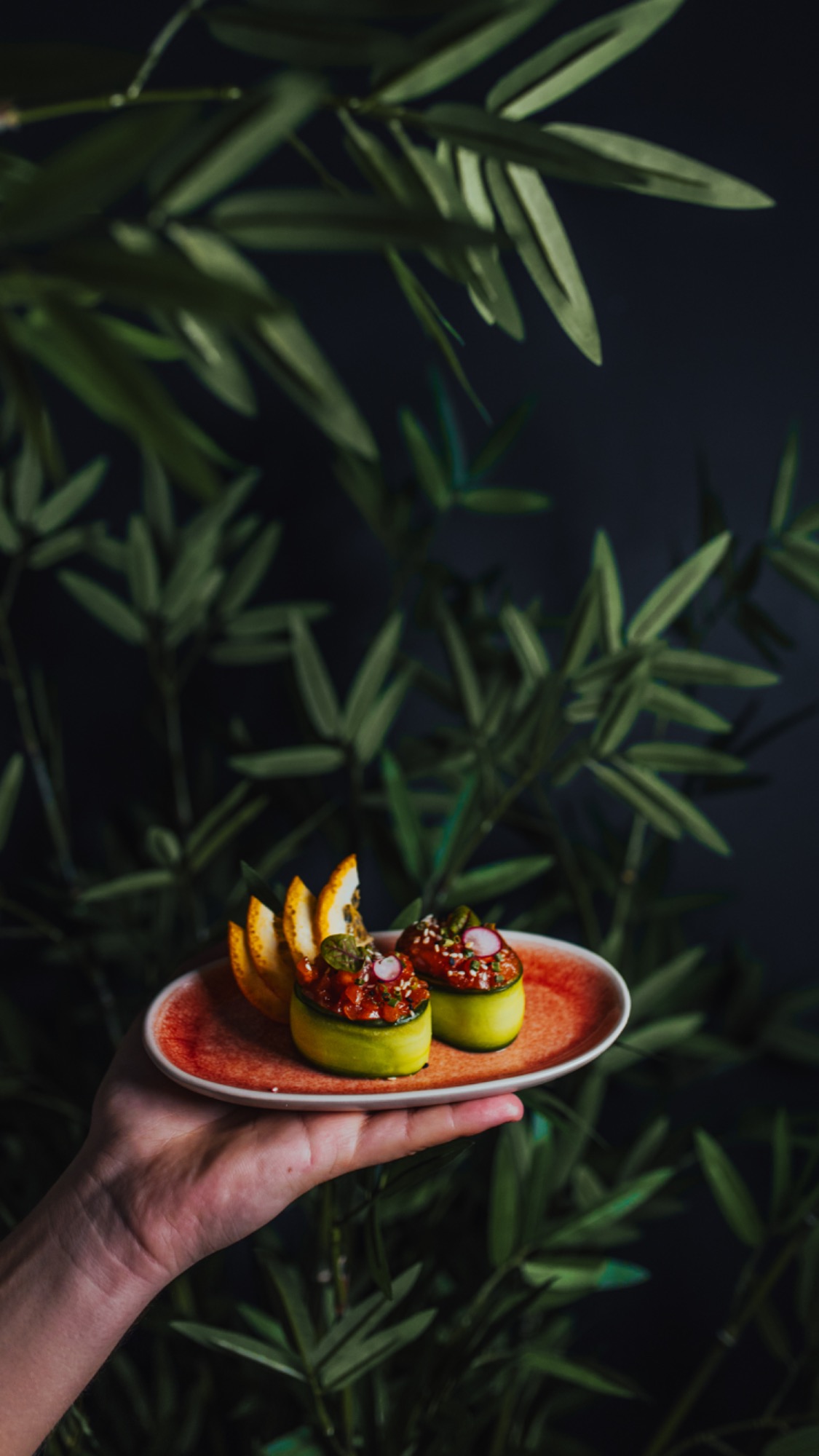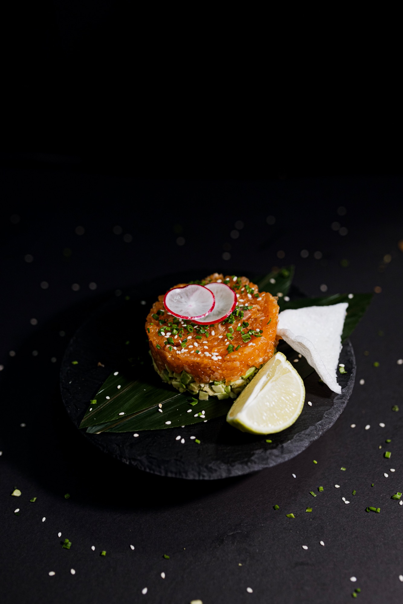California z warzywami w tempurze obłożona opalanym tatarem z łososia